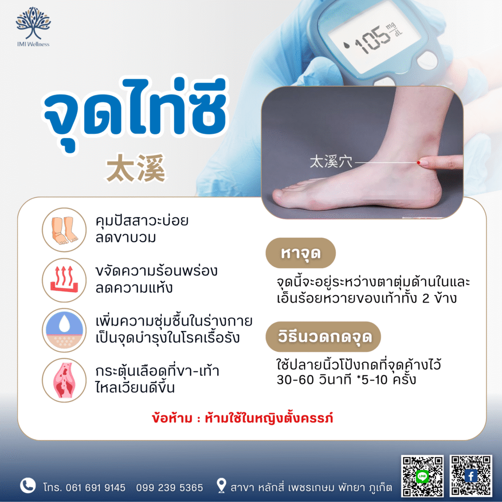 มีความหมายว่า ลำธารใหญ่ อยู่บนเป็นเส้นลมปราณไต เป็นจุดหยวนของไต จะช่วยขจัดความร้อนพร่อง ลดความแห้ง เพิ่มความชุ่มชื้นในร่างกาย เป็นจุดบำรุงในโรคเรื้อรัง คุมการปัสสาวะบ่อย ลดอาการขาบวม กระตุ้นการไหลเวียนเลือดที่ขา เท้า
