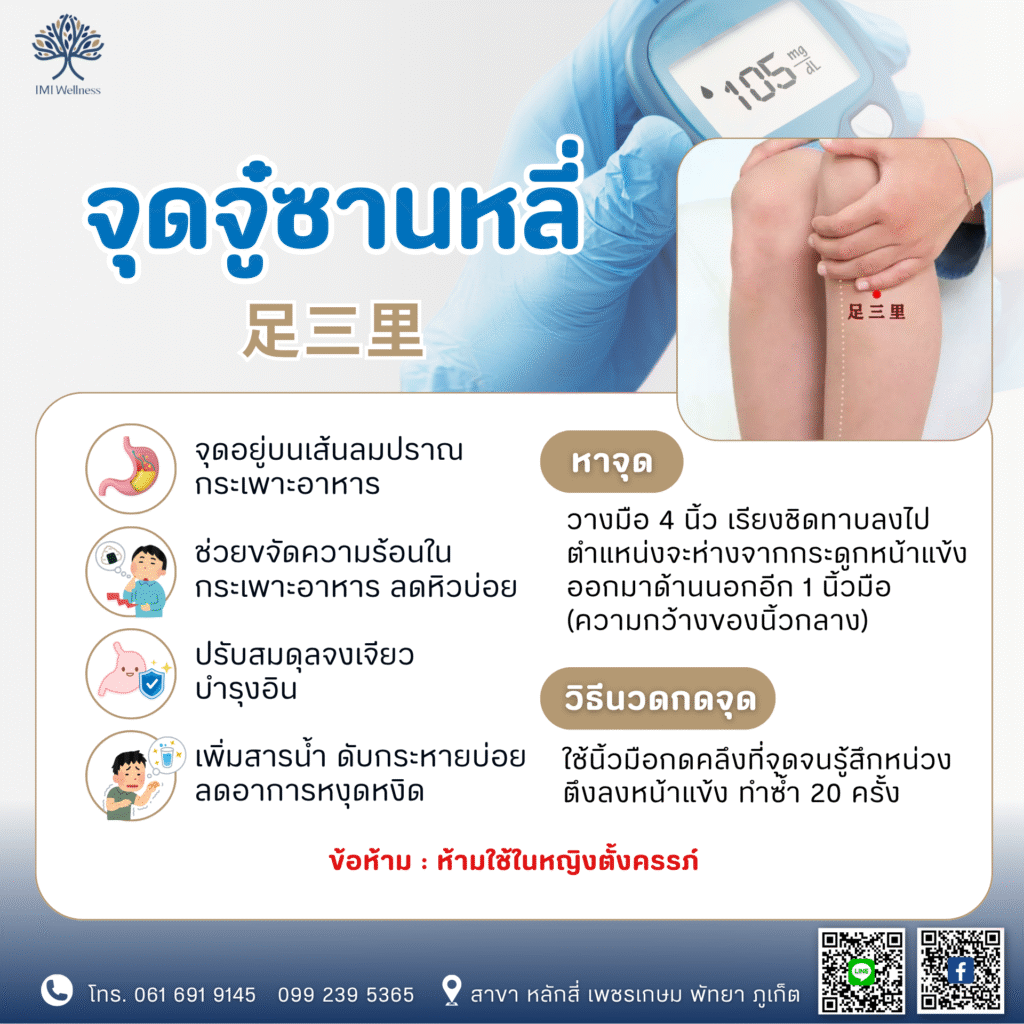 จุดจู๋ซานหลี่ 足三里 (เพิ่มภูมิต้านทาน เสริมการทำงานระบบย่อยอาหาร)