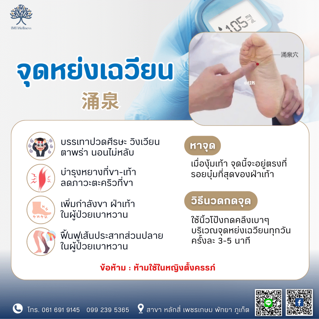 วิธีนวดกดจุด : ใช้นิ้วโป้งกดคลึงเบาๆ บริเวณจุดหย่งเฉวียนทุกวัน ครั้งละ 3-5 นาที