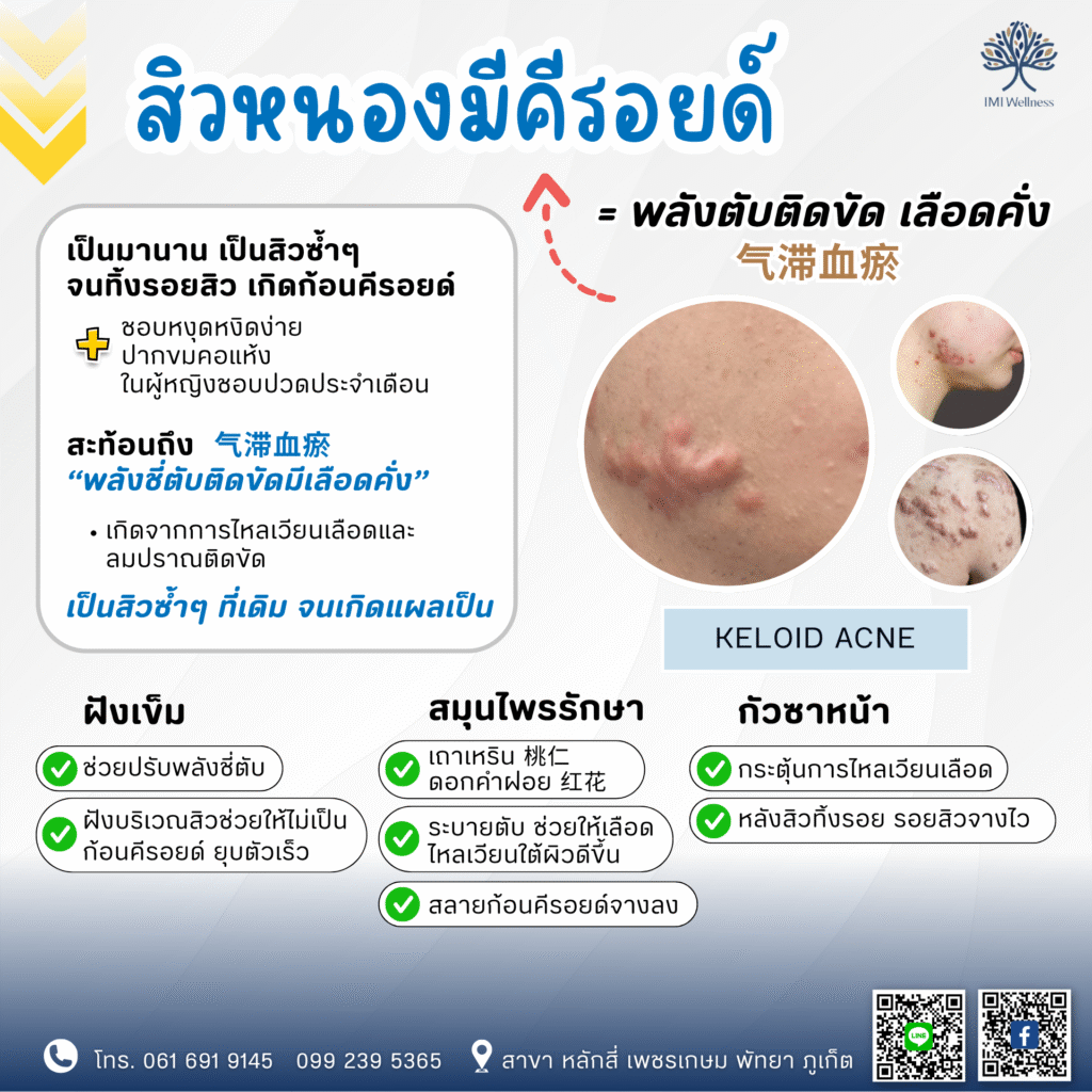 สิวหนองมีคีรอยด์  = พลังตับติดขัด เลือดคั่ง 气滞血瘀