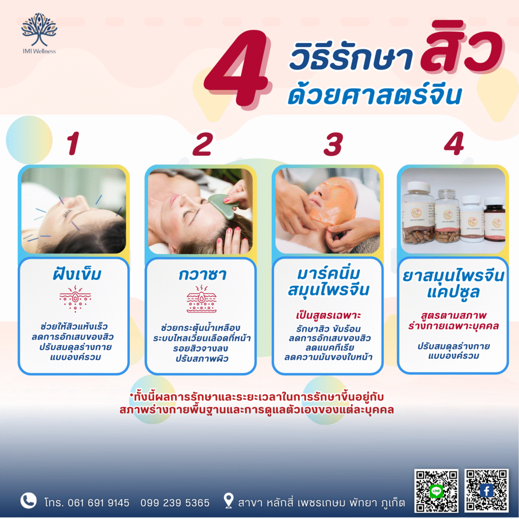 “สิว” เป็นปัญหาผิวหนังที่พบบ่อย สะท้อนถึงความไม่สมดุลภายในร่างกายออกมาทางผิวหนัง เกิดจากการอักเสบของต่อมไขมันใต้ผิวหนังสร้างน้ำมันและไขมันมากเกินไป เกิดการสะสมในรูขุมขนจนอุดตัน และมีแบคทีเรียจนทำให้เกิดสิวอักเสบ เมื่อเป็นแล้วไม่รักษา กด บีบสิวซ้ำ ๆ ทำให้เป็นสิวเรื้อรังได้ เพราะงั้นแพทย์แผนจีนจึงขอแนะนำเคล็ดลับในการรักษาสิว ด้วยศาสตร์การแพทย์แผนจีน เช่น ฝังเข็ม กวาซา ช่วยให้สิวแห้งเร็ว ลดการอักเสบของสิว ช่วยกระตุ้นน้ำเหลือง ระบบไหลเวียนเลือดที่หน้า รอยสิวจางลง ปรับสภาพผิวและปรับสมดุลร่างกายโดยรวมไปในตัว และ มาร์คนิ่มสมุนไพรจีน ที่เป็นสูตรเฉพาะรักษาสิว ช่วยขับร้อน ลดการอักเสบของสิว ลดแบคทีเรียและลดความมันของใบหน้า
