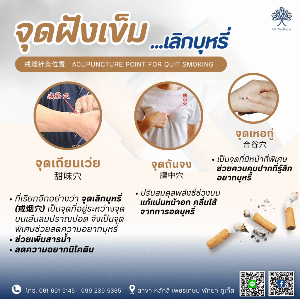 – จุดถันจง (膻中穴) : ปรับสมดุลพลังชี่ตอนบน แก้แน่นหน้าอก คลื่นไส้อาเจียน จากการอดบุหรี่