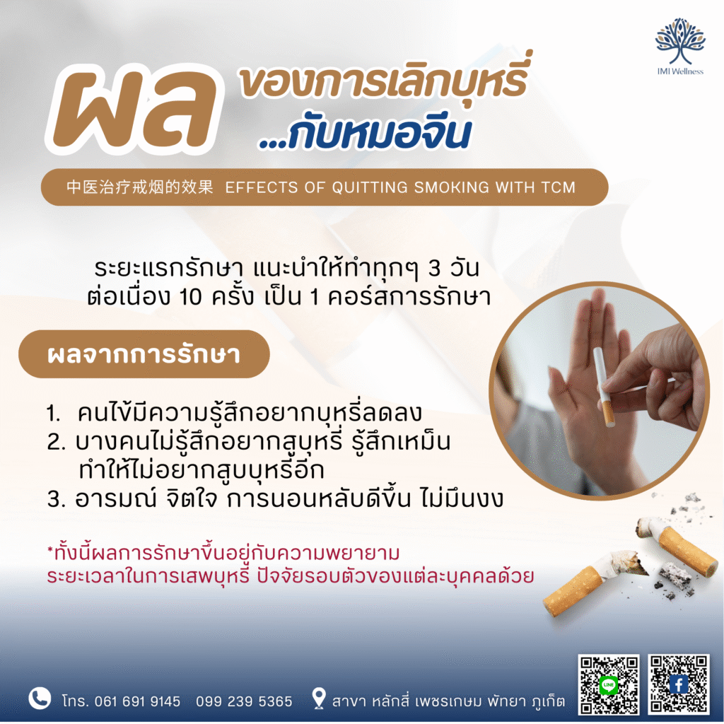 เชื่อว่าหลายคนที่อยากจะเลิกบุหรี่ ไม่ว่าด้วยสาเหตุใดก็ตาม ต่างมีความมุ่งมั่น ตั้งใจอยากจะเลิกให้ได้ อาจจะลองมาหลายวิธีเห็นผลบ้าง เห็นผลช้า ทำได้ยาก เกือบจะท้อจนล้มเลิกไปก็มี หากวิธีที่ทำอยู่ยังไม่เห็นผล ลองมาปรึกษาหมอจีนของ IMI Wellness เราได้