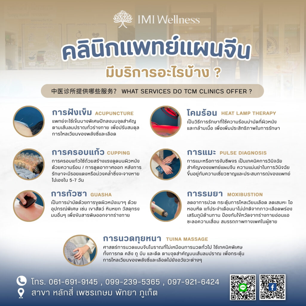 ในยุคที่ผู้คนหันมาใส่ใจสุขภาพแบบองค์รวมมากขึ้น การแพทย์แผนจีนกำลังได้รับความนิยมอย่างแพร่หลายในเมืองไทย ด้วยรากฐานอันเก่าแก่กว่าพันปีและแนวคิดการรักษาที่มุ่งสร้างสมดุลให้ร่างกาย คลินิกแพทย์แผนจีนจึงเป็นตัวเลือกที่น่าสนใจสำหรับผู้แสวงหาการรักษาที่ปลอดภัยและได้ผล ไม่ว่าจะเป็น การฝังเข็ม การนวดทุยหนา หรือ การครอบแก้ว ที่ IMI Wellness เรามีบริการการแพทย์แผนจีนครบวงจรพร้อมช่วยให้คุณฟื้นฟูสุขภาพและกลับมาใช้ชีวิตได้อย่างสมดุล