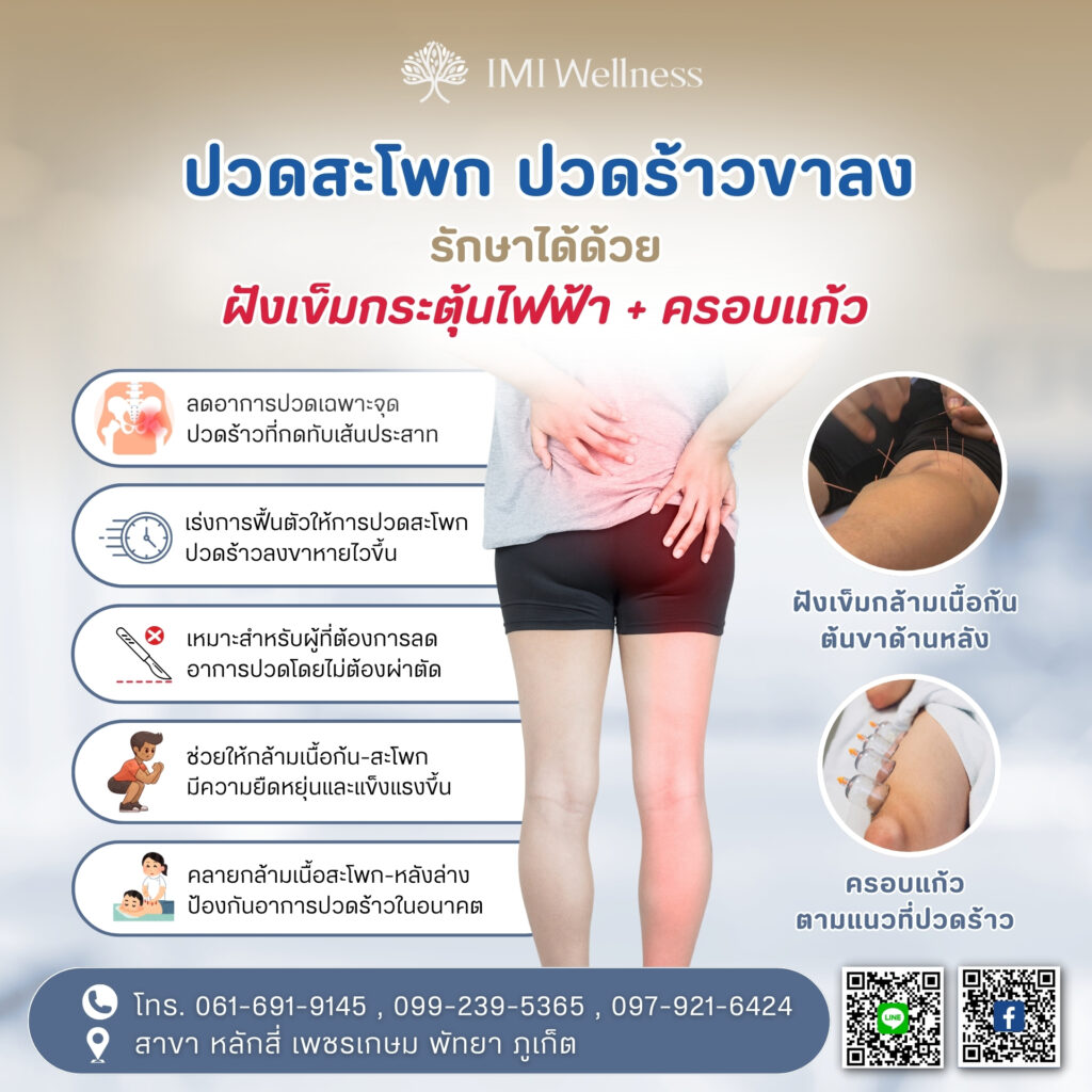อาการปวดสะโพกร้าวลงขาที่ทำให้การลุกเดินเป็นเรื่องยาก มักเกิดจากการกดทับของเส้นประสาทไซอาติกหรือกล้ามเนื้อสะโพกหนีบเส้น ซึ่งการแพทย์แผนจีนสามารถดูแลได้โดยไม่ต้องผ่าตัด ด้วยการผสมผสานการฝังเข็มกระตุ้นไฟฟ้าและการครอบแก้วเพื่อคลายจุดกดทับ ช่วยลดอาการปวดและชาได้อย่างมีประสิทธิภาพ คืนความคล่องตัวให้คุณกลับมาเคลื่อนไหวได้สะดวก และลดโอกาสที่อาการจะกลับมากวนใจในอนาคต