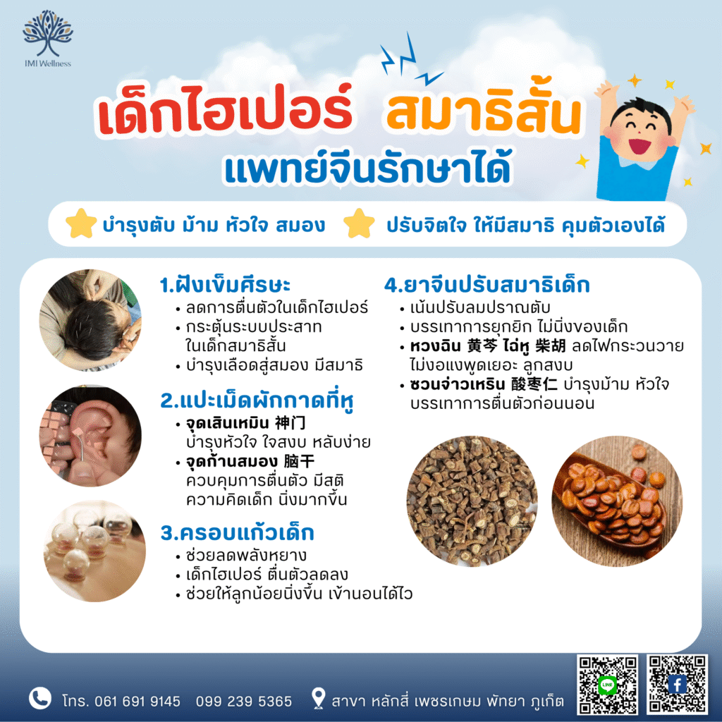 แพทย์แผนจีนจะใช้จุดต่างๆ เหล่านี้ จะช่วยสงบจิตใจ ความคิดให้นิ่งขึ้น ช่วยลดพลังตื่นตัวของเด็กไฮเปอร์ บำรุงเลือดสู่สมอง เพิ่มการรับรู้ของเด็กสมาธิสั้น ปรับจิตใจเด็ก ให้เด็กมีสมาธิ ไม่ยุกยิกมาก คุมตัวเองได้