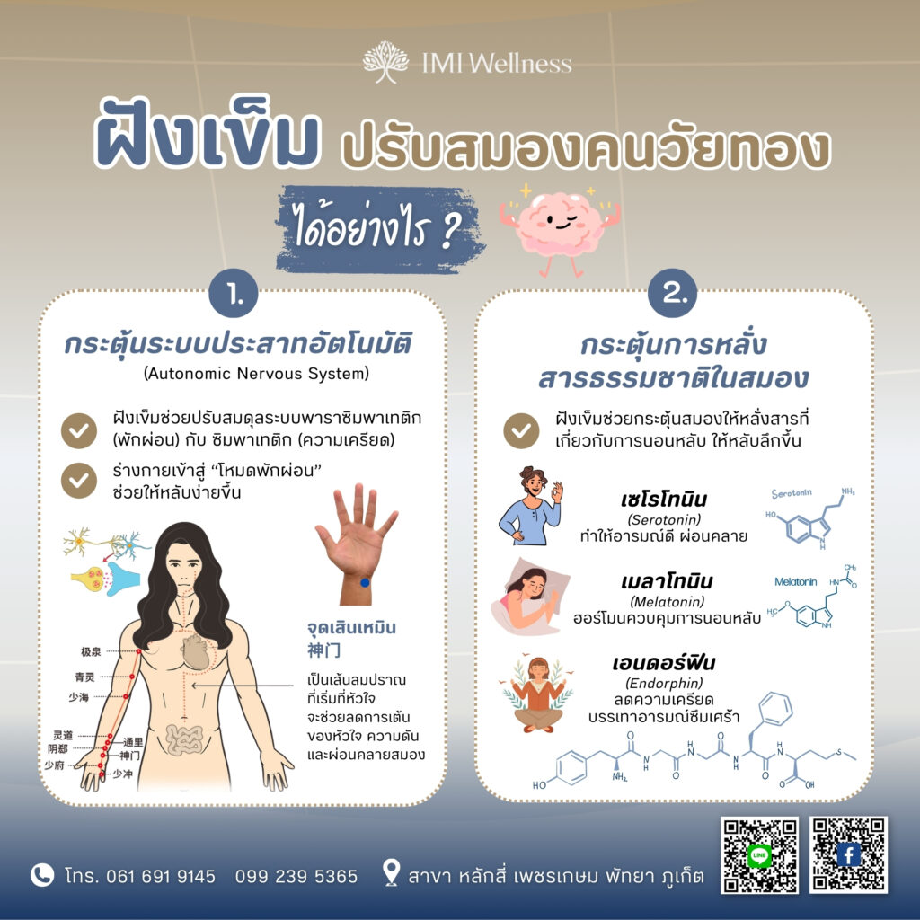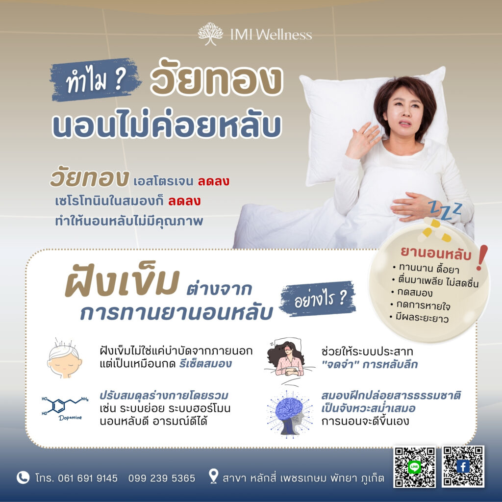 “การฝังเข็มไม่ใช่แค่บำบัดจากภายนอก แต่เป็นเหมือนกดรีเซ็ตสมอง ปรับสมดุลระบบประสาทและสารเคมีในสมองจากภายใน” จึงเหมาะอย่างยิ่งกับผู้ที่อยู่ในช่วงวัยทองที่ต้องการฟื้นฟูสุขภาพการนอนอย่างเป็นธรรมชาติ โดยไม่พึ่งยา