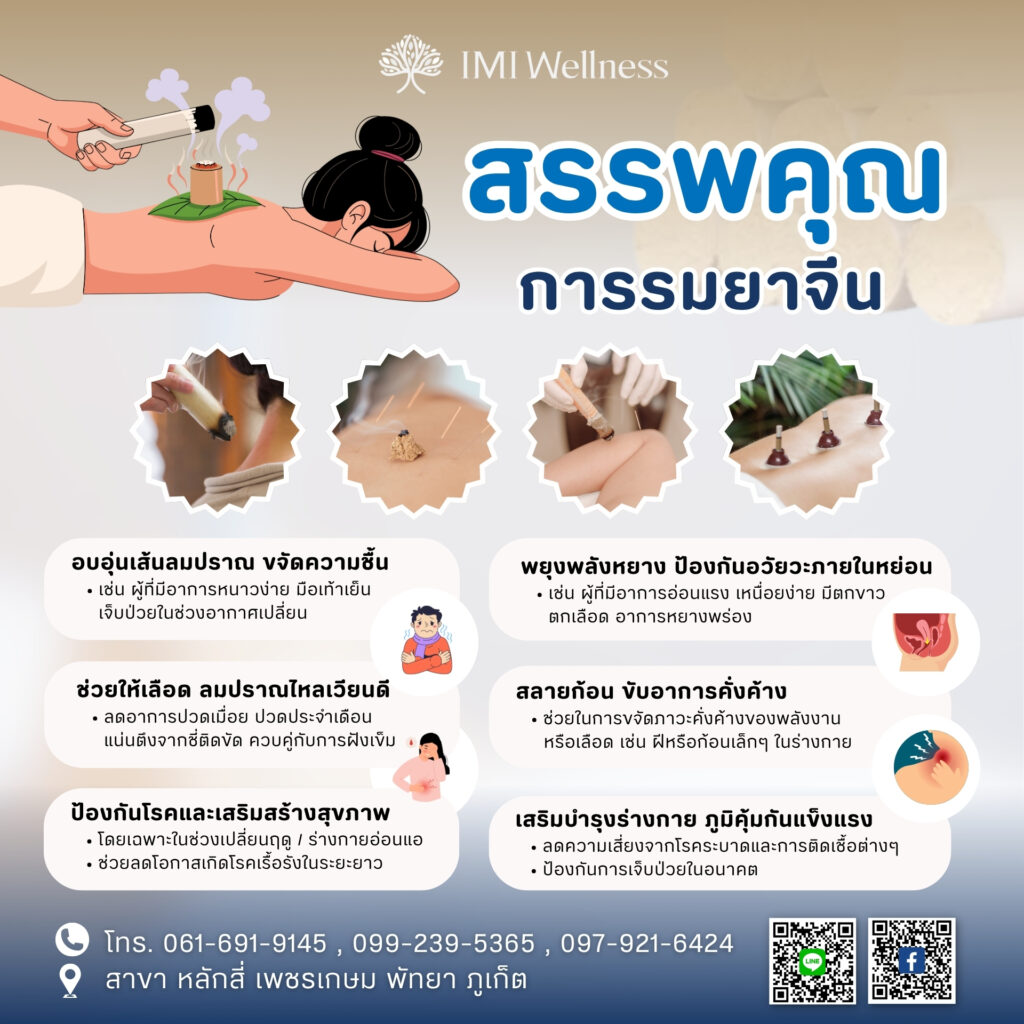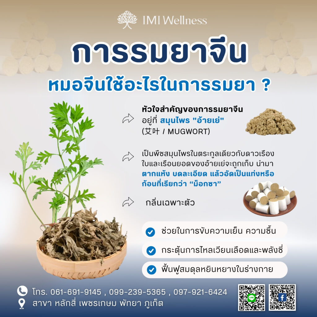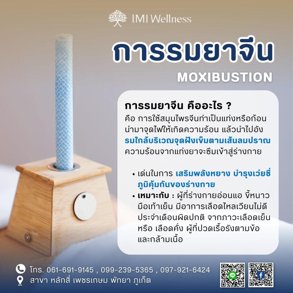 การรมยาจีน (Moxibustion) คือศาสตร์การดูแลสุขภาพตามแนวทางแพทย์แผนจีนที่ได้รับการยอมรับและสืบทอดมาหลายศตวรรษ โดยมีเป้าหมายหลักคือการปรับสมดุลร่างกาย เสริมภูมิคุ้มกัน บรรเทาอาการเรื้อรัง และช่วยป้องกันโรคต่าง ๆ ได้อย่างปลอดภัย เมื่อเข้ารับบริการกับคลินิก IMI Wellness คุณจะมั่นใจได้ว่าได้รับการดูแลโดยทีมแพทย์แผนจีนที่มีความรู้ พร้อมการวินิจฉัยอย่างละเอียดและคำแนะนำที่เหมาะสม เพื่อให้คุณก้าวสู่สุขภาพที่แข็งแรงและสมดุลอย่างยั่งยืน