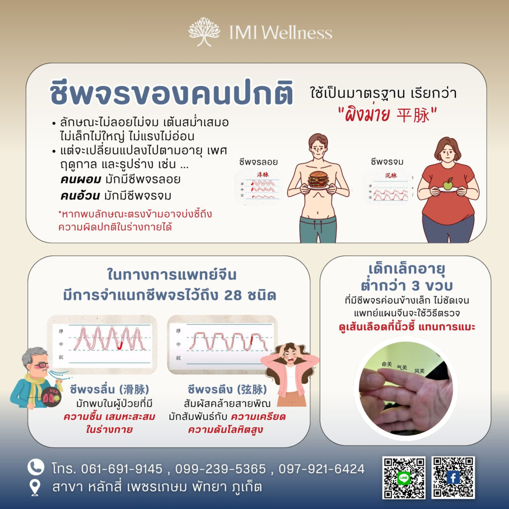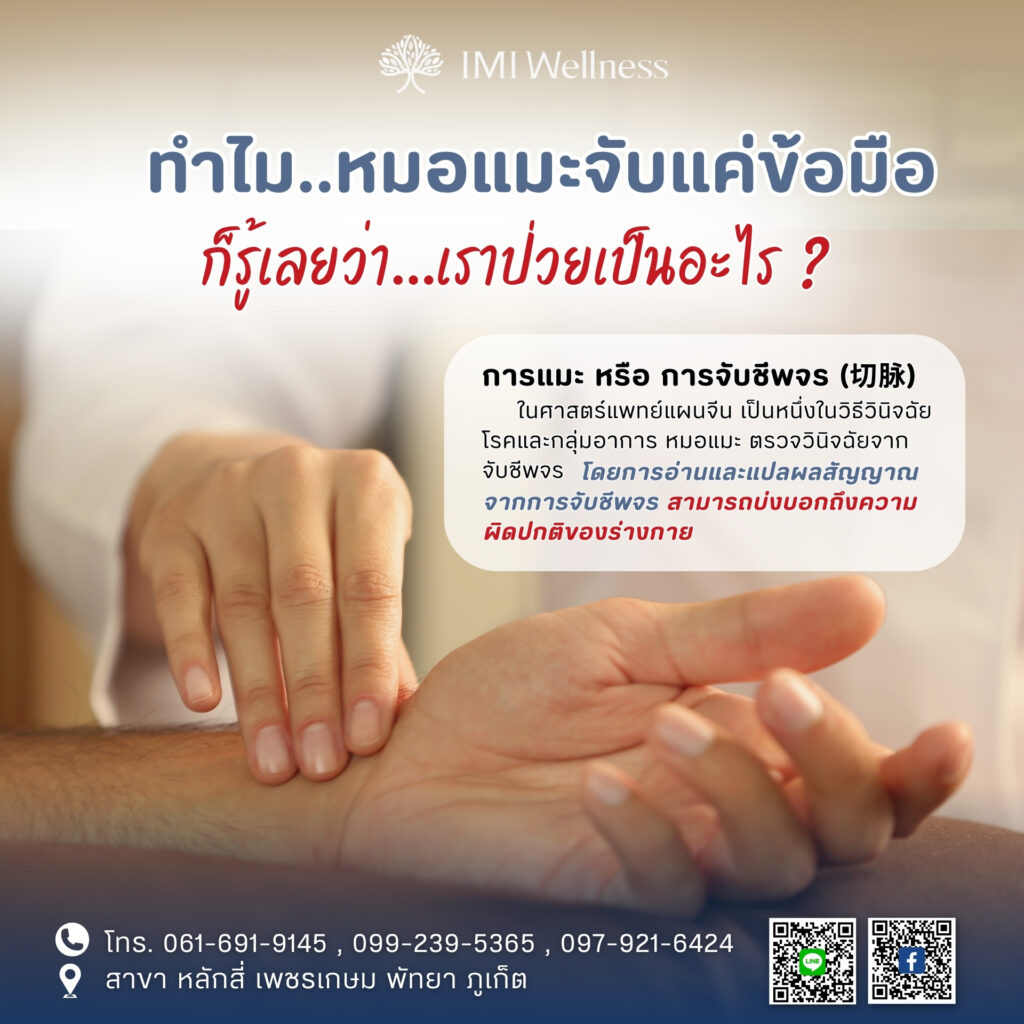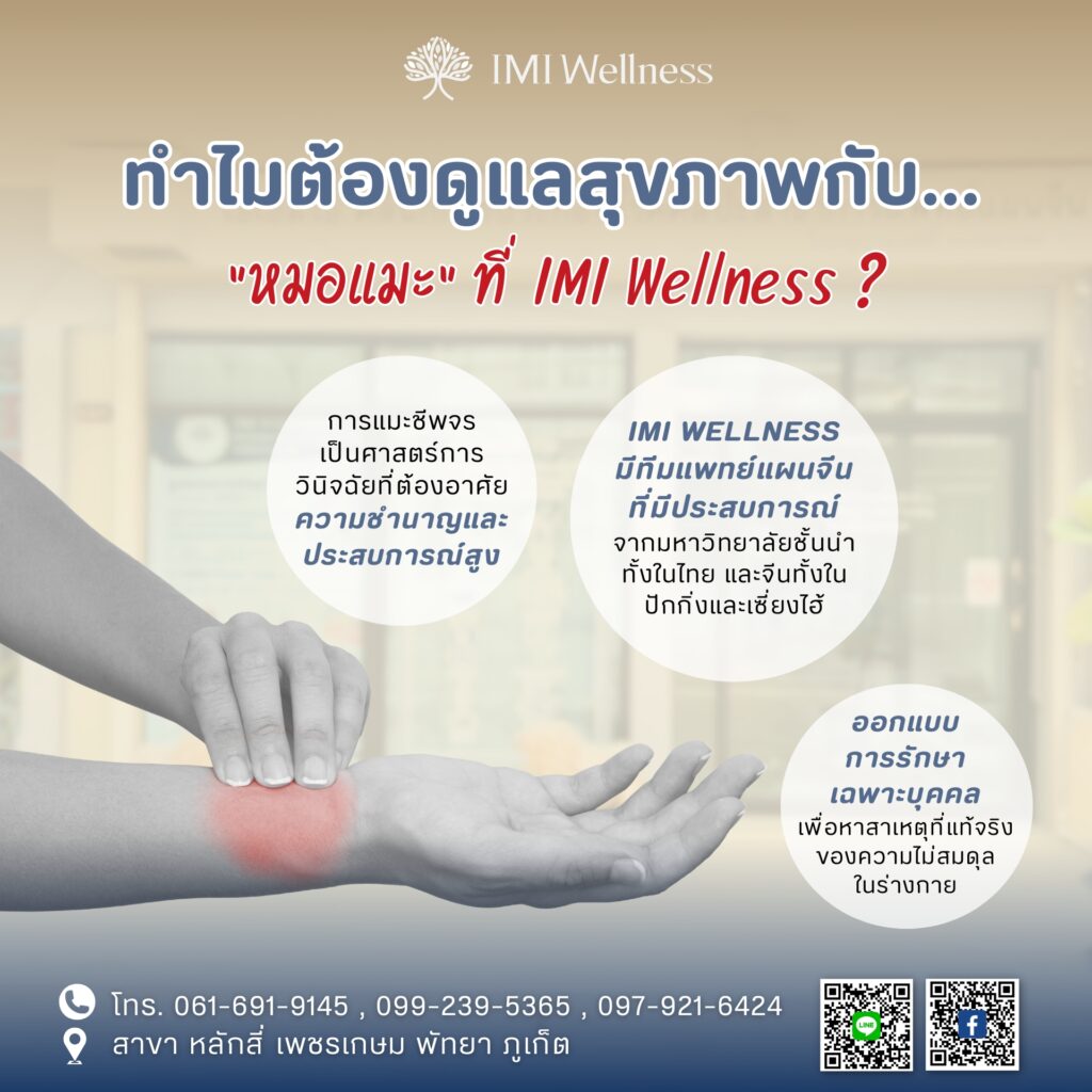 การแมะชีพจรเป็นศาสตร์การวินิจฉัยที่ต้องอาศัยความชำนาญและประสบการณ์สูง ที่ IMI Wellness เรามีทีมแพทย์แผนจีนที่มีประสบการณ์ที่จบการศึกษาจากมหาวิทยาลัยชั้นนำทั้งในไทย และจีนทั้งในปักกิ่งและเซี่ยงไฮ้ ทำทีมโดยแพทย์จีนหัวเฉียวรุ่นแรกในประเทศไทย ซึ่งมีความเชี่ยวชาญในการแมะและวินิจฉัยโรคตามแนวทางแพทย์แผนจีนแบบดั้งเดิม พร้อมบูรณาการกับความเข้าใจในบริบทสุขภาพยุคปัจจุบัน แพทย์แผนจีนของเราสามารถออกแบบการรักษาเฉพาะบุคคลโดยการตรวจวินิจฉัยอย่างละเอียดเพื่อหาสาเหตุที่แท้จริงของความไม่สมดุลในร่างกาย