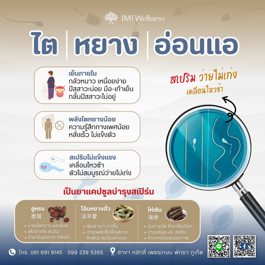 ไตหยางอ่อนแอ จะมีอาการ “เย็นภายใน” กลัวหนาว ปัสสาวะบ่อย มือเย็น-เท้าเย็น กลั้นปัสสาวะไม่อยู่ ถ่ายเหลว เหนื่อยง่าย พลังไตหยางน้อย ความรู้สึกทางเพศน้อย จนไม่สามารถคุมของเหลวในร่างกายได้ มักจะหลั่งเร็ว ไม่แข็งตัว สเปริมไม่แข็งแรง เคลื่อนไหวช้า ตัวไม่สมบูรณ์ว่ายไม่เก่ง