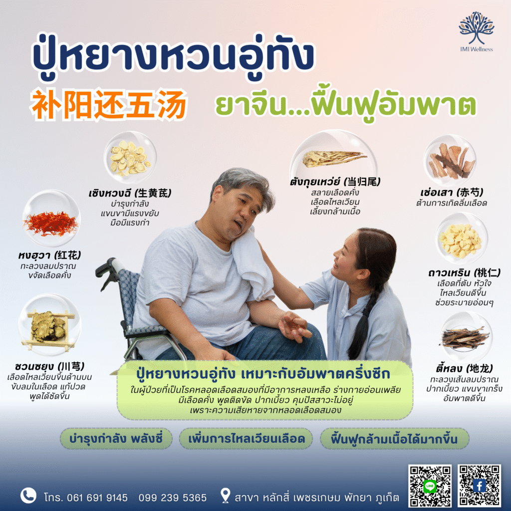ตำรับปู่หยางหวนอู่ทัง补阳还五汤 เหมาะกับอัมพาตครึ่งซีก บำรุงกำลัง พลังชี่ เพิ่มการไหลเวียนเลือด ทะลวงลมปราณและฟื้นฟูกล้ามเนื้อได้มากขึ้น ในผู้ป่วยที่เป็นโรคหลอดเลือดสมองที่มีอาการหลงเหลือ ร่างกายอ่อนเพลีย มีเลือดคั่ง พูดติดขัด ปากเบี้ยว คุมปัสสาวะไม่อยู่ เพราะความเสียหายจากหลอดเลือดสมอง