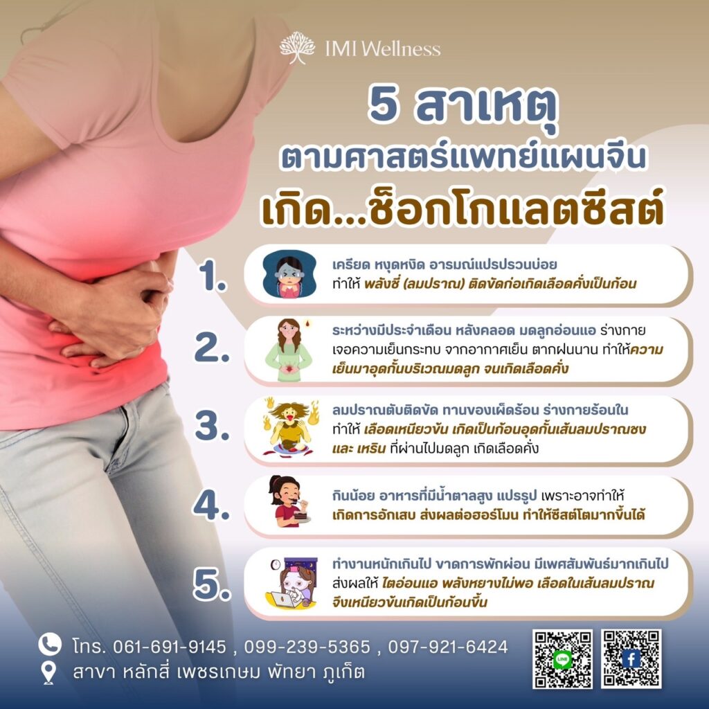 อาการปวดประจำเดือนรุนแรงจาก "ช็อกโกแลตซีสต์" ไม่จำเป็นต้องจบลงที่การผ่าตัดเสมอไป ในมุมมองแพทย์แผนจีน ภาวะนี้เกิดจาก "เลือดคั่ง" และการไหลเวียนของลมปราณที่ติดขัด IMI Wellness พร้อมดูแลคุณด้วยตำรับยาสมุนไพรจีนที่มุ่งเน้นการสลายเลือดคั่งและปรับสมดุลมดลูก เพื่อช่วยลดขนาดซีสต์และบรรเทาความเจ็บปวดที่ต้นเหตุ ทีมแพทย์จีนผู้ชำนาญการของเราพร้อมวางแผนการรักษาเพื่อให้คุณกลับมามีสุขภาพที่ดีและลดความกังวลใจ