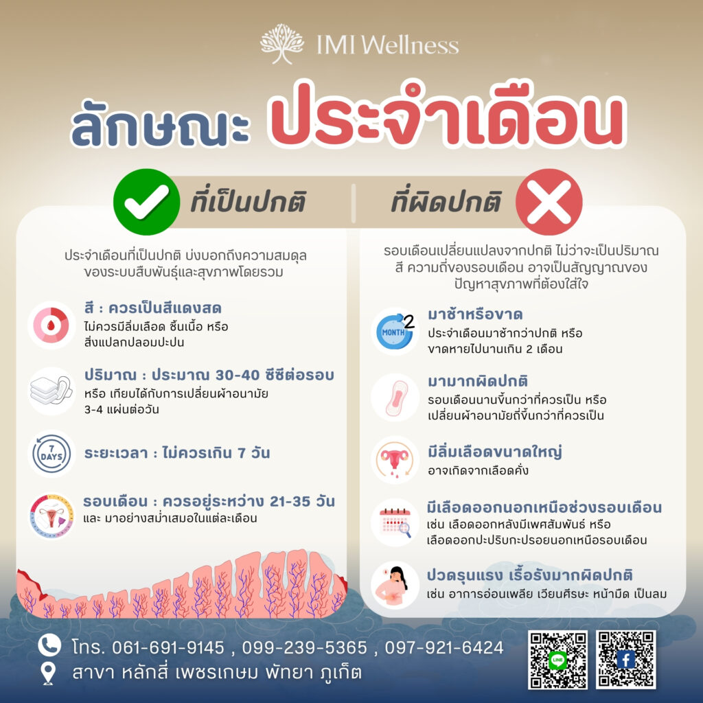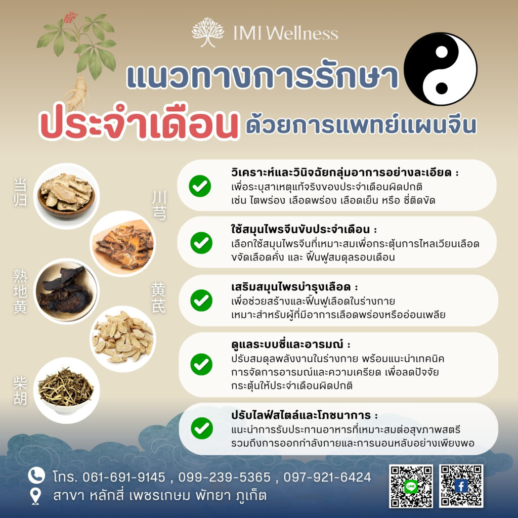IMI Wellness มีความชำนาญในการดูแลสุขภาพสตรีแบบองค์รวม ด้วยทีมแพทย์แผนจีนที่มีประสบการณ์ เข้าใจความแตกต่างเฉพาะตัวของแต่ละบุคคล การวินิจฉัยและการวางแผนการดูแลจะมุ่งเน้นหาสาเหตุที่แท้จริง พร้อมเลือกใช้สมุนไพรจีนขับประจำเดือนและสมุนไพรบำรุงเลือดอย่างเหมาะสม เพื่อฟื้นฟูสมดุลร่างกายอย่างปลอดภัย หากคุณมีปัญหาเกี่ยวกับรอบเดือน สามารถติดต่อขอคำปรึกษาได้ที่ IMI Wellness ทุกสาขา
