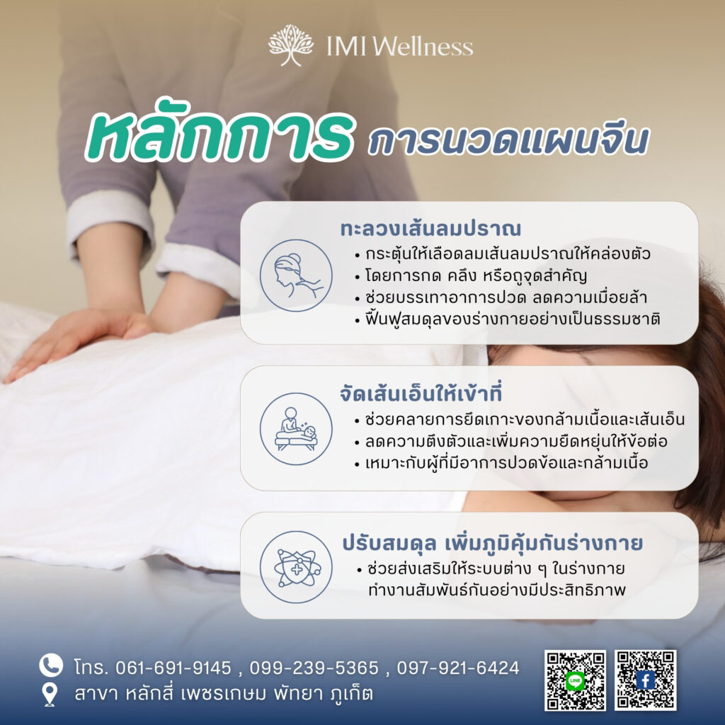 นวดแผนจีน หรือที่เรียกกันว่านวดทุยหนา คือศาสตร์แห่งการดูแลสุขภาพที่สืบทอดภูมิปัญญามาอย่างยาวนาน หลายคนอาจสงสัยว่านวดแผนจีนสามารถบรรเทาหรือรักษาโรคอะไรได้บ้าง? บทความนี้ IMI Wellness จะพาคุณไปรู้จักพื้นฐานของนวดแผนจีน หลักการที่สำคัญ รายละเอียดของแต่ละอาการที่เหมาะกับการนวดทุยหนา พร้อมทั้งข้อมูลที่ควรรู้และวิธีเตรียมตัวก่อนรับบริการ เพื่อให้ผู้อ่านได้รับความเข้าใจที่ถูกต้อง และตัดสินใจเลือกใช้การดูแลสุขภาพทางเลือกนี้ได้อย่างมั่นใจ